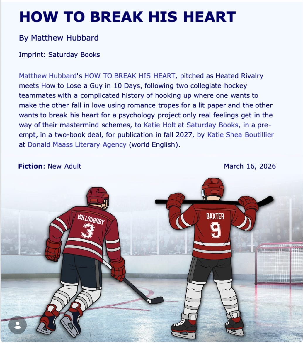 In this book deal announcement, you see the familiarity coming through in mostly comp titles and tropes. These are things we already know people like, delivered in a new and fresh way. Comp Titles: How to Lose a Guy in 10 Days and Heated Rivalry. Tropes: enemies to lovers, fake dating, hockey romance.